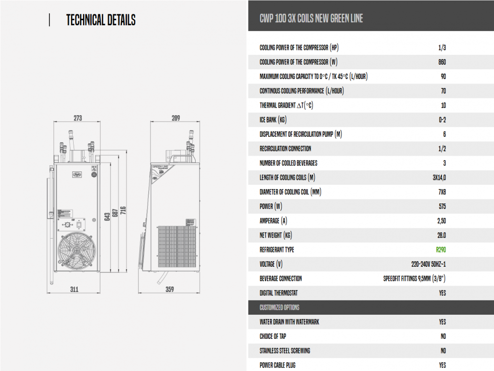 CWP 100 3x coils new Green Line is a professional-grade water-cooled beverage dispensing system, ideal for restaurants, events, and other settings where efficient and continuous beverage cooling and dispensing are required.