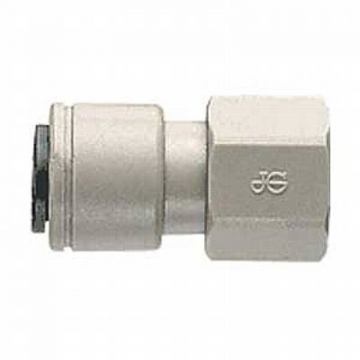 Adapteriliitin sisäpuolisella 1/4" FFL-kierteellä ja 9,5 mm (3/8") ulkohalkaisijaltaan olevalle jäykälle letkulle tarkoitetulla JG-puristusliittimellä.